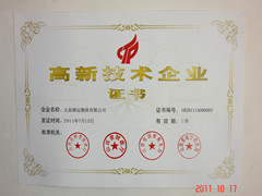 2011年7月12日,經(jīng)山西省科技廳、省財政廳、省國稅局、省地稅局組成的山西省高新技術(shù)企業(yè)認(rèn)定管理機(jī)構(gòu)批準(zhǔn),我公司被認(rèn)定為高新技術(shù)企業(yè)。