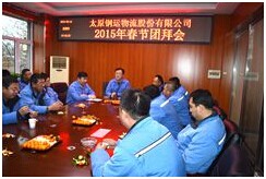 2015年2月19日,公司召開春節(jié)團(tuán)拜會(huì)。公司總經(jīng)理胡永生代表董事會(huì)向全體職工及家屬送上誠(chéng)摯的春節(jié)祝福,同時(shí)各部門各分公司經(jīng)理也表達(dá)出對(duì)鋼運(yùn)物流的深切祝福。會(huì)后,總經(jīng)理助理尹躍飛、郝建國(guó)深入現(xiàn)場(chǎng)慰問一線職工。